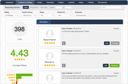 - Effortlessly manage your online reputation in one simple and user-friendly dashboard that displays an overall feedback and online rating score for your business.